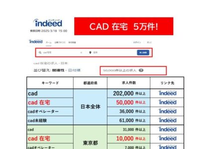 感謝してます! 久しぶりに「CDIキャリアスクール あべちゃん先生のひとり言」のブログです。 2025年3月18日現在、日本全国で遂に「CADの在宅求人が、5万件を超えました!」 都道府県別でみると、東京都が『1万件以上 … 続きを読む エッ! CADの在宅求人が『5万件越え!』