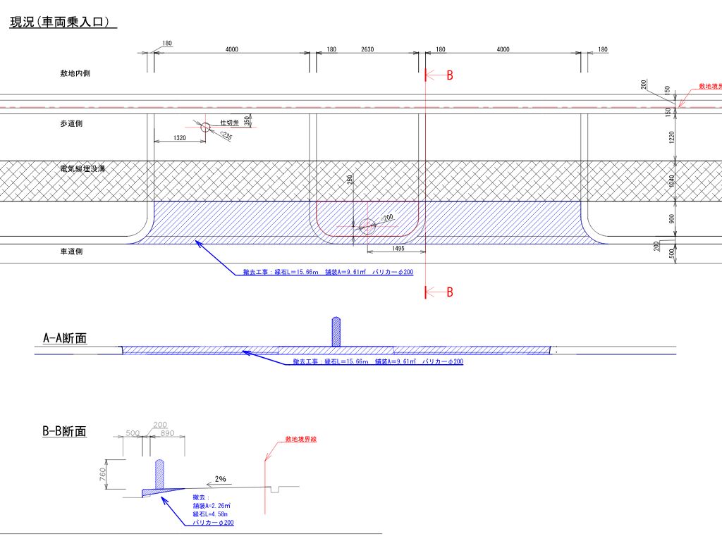 ②現況図(車両乗入口)※受講生(大塚様)が測量したメモを元に現況図面を作成。