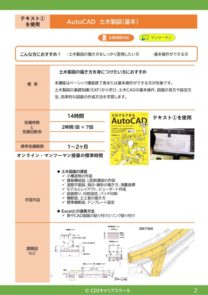 土木未経験者・新人の方が多い場合は、土木新人向けAutoCAD土木講座をご案内しています。