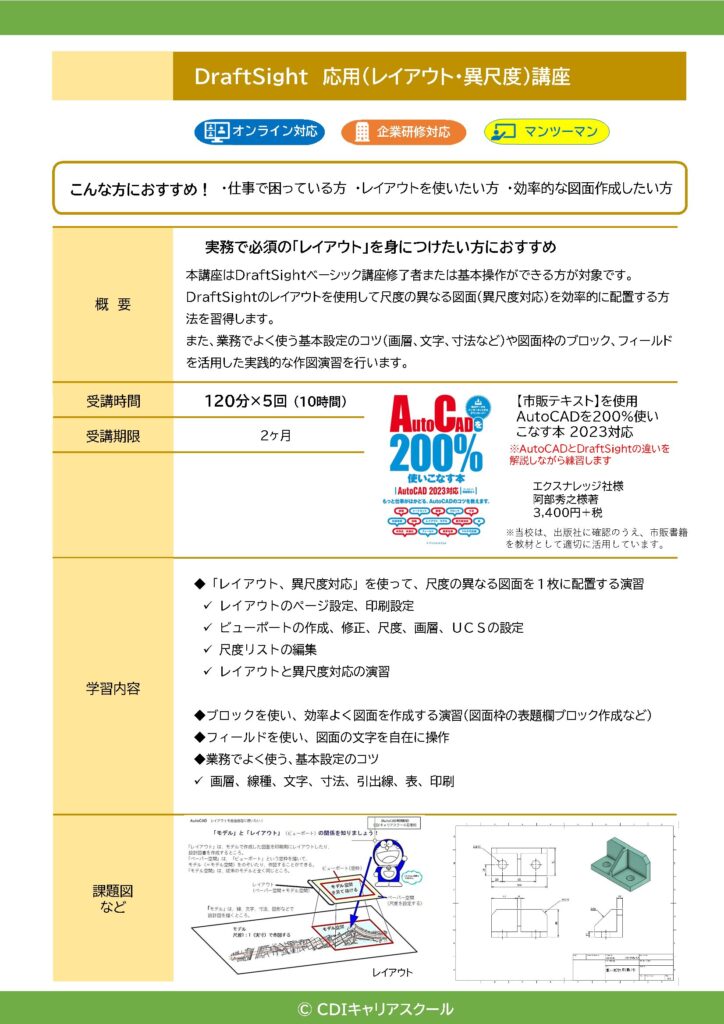 CDIキャリアスクールでは、DraftSightの操作説明に加えて、旧CADで行っていた図面運用を整理し、DraftSightでどのように再構築するかといった視点からのご相談にも対応しています。