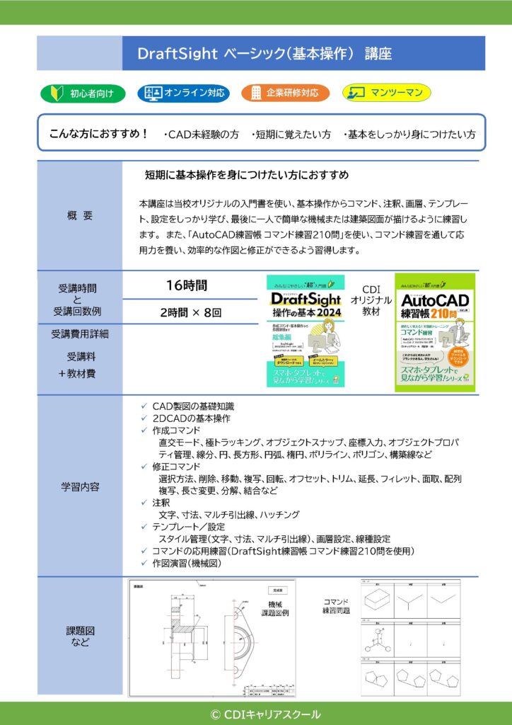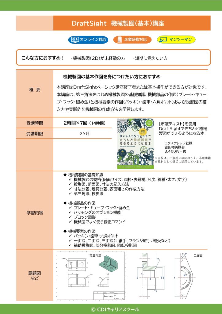 CDIキャリアスクールでは「DraftSight基本+実務」講座を8日間で完結するカリキュラムとしてご提供しています。講座終了後も、講師が1ヶ月サポート(※)しますのでご安心ください。※メール・LINE・ZOOM・動画配信等