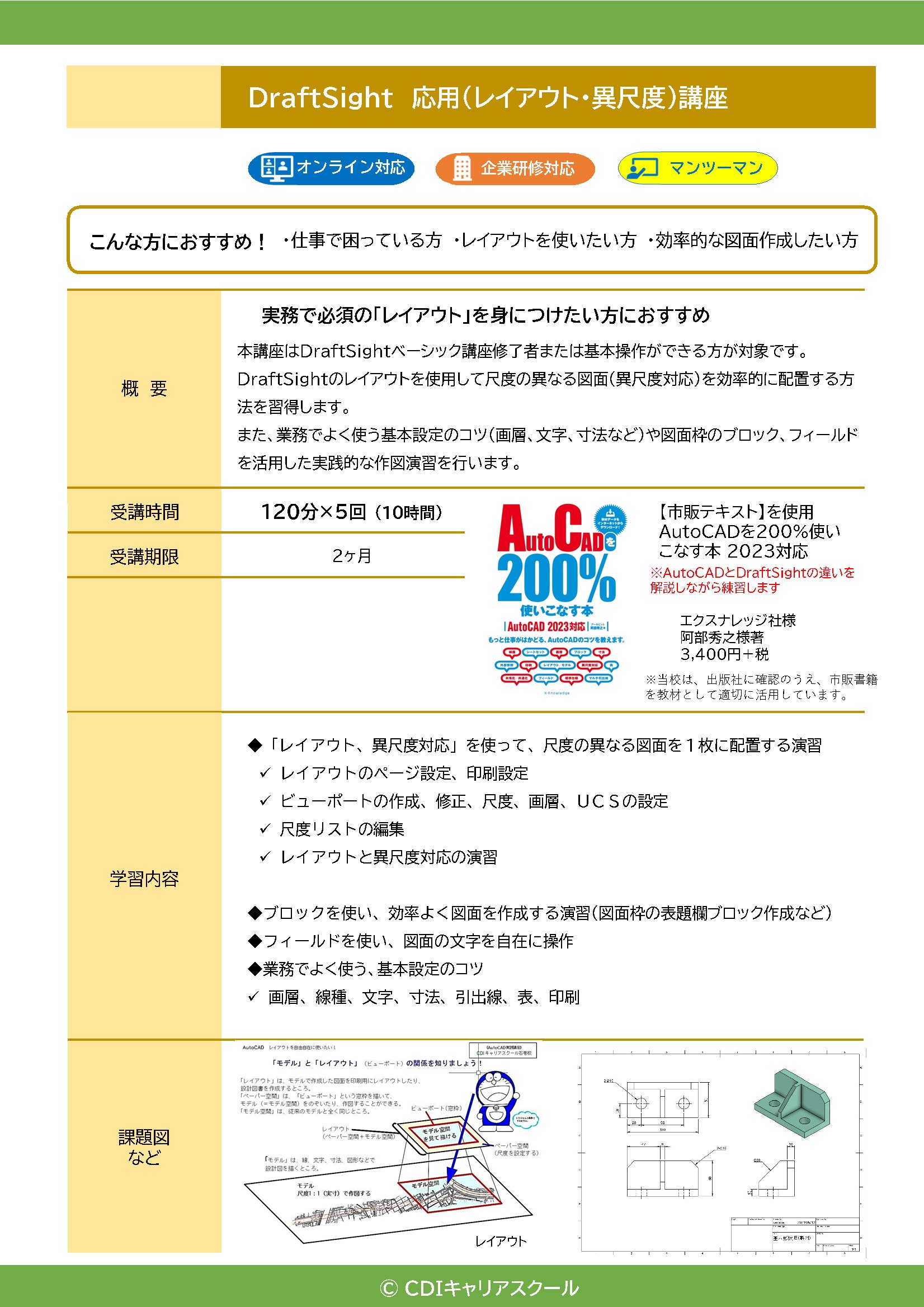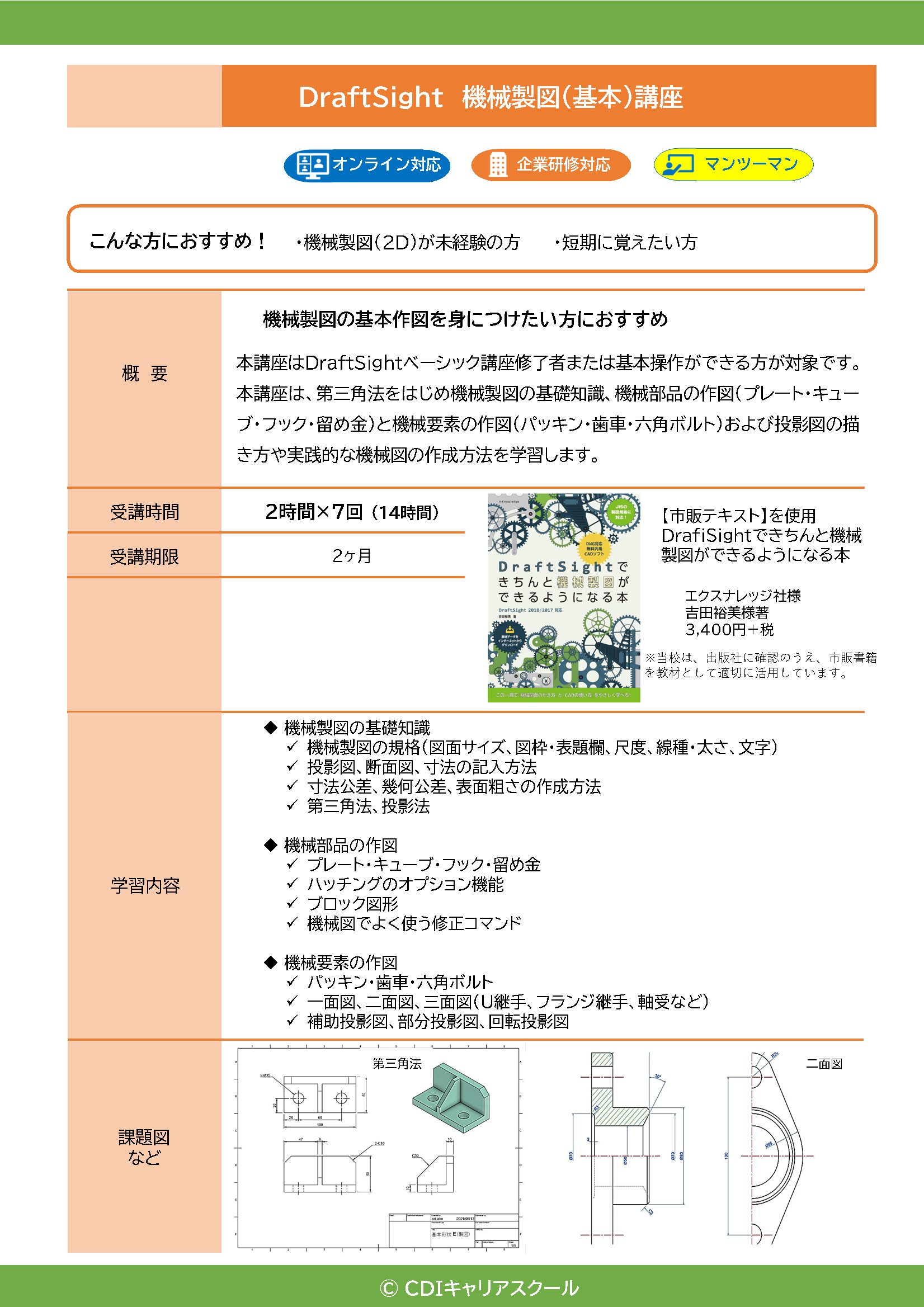 CDIキャリアスクールでは、DraftSightの操作説明に加えて、旧CADで行っていた図面運用を整理し、DraftSightでどのように再構築するかといった視点からのご相談にも対応しています。