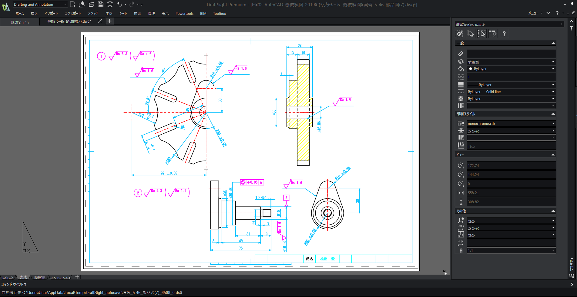 また、実践演習は一面図、二面図、三面図の課題演習やねじ・ボルトナット、歯車、軸受、投影図などの描き方を学習します。